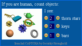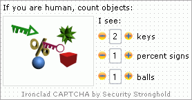 Warum soll ich es verwenden?Fast jede Webseite auf der Erde, die irgendeines Formular enthält, das die Besucher registriert, anmeldet und zulasst, oder einige Informationen vorliegt, leidet unter Spam. Es gibt Tausende von Roboter-Programme, die im Internet surfen und die Formulare füllen um ihren Websites zu fördern, auch erlauben sie die unerwünschte Werbung oder sogar gefährden den Web-Sites, die sie besuchen. Wenn Sie einige Forum, Blog, Social-Networking-Site oder eine Website mit Registrierung / Login-Prozedur besitzen, wissen Sie, dass Spam leicht töten jedes gute Projekt in der Frage von Tagen kann. Die wirksamste Maßnahme gegen Spam ist Benutzer einige Test weitergeben zu verlangen, der oft als CAPTCHA (Completely Automated Public Turing Test to make Computer and Human Apart) genannt ist. In den meisten Fällen sollten Anwender geben einige Buchstaben oder Zahlen oder Worte ein, die er auf das Bild (welches geschraubt, durch Linien gekreuzt ist) sieht, um den Test zu bestehen und dann dürft er ein Formular einreichen. Schlechte Nachrichten: Alle konventionelle CAPTCHA Programme sind schon geknackt. Es gibt die Programme, die Ihre aktuelle CAPTCHA mit 80% Genauigkeit erkennen kann, dass bedeutet, dass Ihre Website sowieso gespammt WIRD. Auch die derzeitigen CAPTCHA Programme von Google und Yahoo sind bereits geknackt (dies gemunkelt, dass er für lange Zeit unmöglich, aber nicht heute). Zwar gibt es Programme, die sie mit 35% Genauigkeit erkennen, ist es immer noch genug! Es bedeutet nur, dass Roboter dreimal im Durchschnitt versuchen wird, bevor er sich erfolgreich seine Spam unterwirft. Ironclad CAPTCHA ist etwas anders. Warum nennen Sie Ihr Ironclad CAPTCHA "undurchdringbar"?Weil es undurchdringbar ist. Niemand kann es heute knacken, und wahrscheinlich wird niemand in nächsten 10 Jahren. Anstatt den Anwender zu fragen, die Buchstaben und Zahlen zu eingeben (die sogar reale menschliche manchmal nicht erkennen kann, aber die Computer schon können!), wir zeigen ihm ein Bild mit mehreren primitiven Objekten wie Teekannen, Schlüssel, Bälle, und so weiter. Ironclad CAPTCHA wird in Echtzeit von 3D-Szene gerendert, wobei jedes Objekt positioniert, skaliert, gedreht wird, und in zufälliger Weise farbig wiedergegeben wird. Wir benötigen dann Benutzer, um die Anzahl von drei gegebenen Typen auf dem Bild zu zählen, um den Test zu bestehen. Dies ist die Aufgabe, dass selbst jedes Kind erreichen kann! Aber keiner Computer. In dem Bild, wo es eine Menge von Objekten gibt, die nicht durch ihre Form bestimmt werden kann (weil die Form dramatisch verändern kann, wenn das Objekt skaliert und gedreht wird), durch ihre Farbe (verschiedene Objekte können ähnliche Farben und mehrere Objekte eines bestimmten Typs kann in unterschiedlichen Farben) und sie kann nicht segmentiert werden (weil Objekte schneiden, überlagern, etc.) Computer wirft seine virtuelle Hand und gibt auf! Wow! Aber kann ich es nutzen für meine Website? Ist es kostenlos? Ist es zuverlässig?Absolut! Sie können es kostenlos für jede Website verwenden, auch wenn es kommerziell ist und auch wenn es beliebt ist und wenn es eine Menge Verkehr hat - unsere Kapazitäten sind hoch und wir können fast jede Ladung zu bewältigen und Ironclad CAPTCHA zu Ihrer Website in keinem Fall liefern. Ironclad CAPTCHA liegt auf einem eigenen dedizierten Server in einem der wichtigsten Rechenzentren in New York statt. Wenn wir sagen, dass man Ironclad CAPTCHA auf jeder Website verwenden kann, gibt es jedoch einige Ausnahmen. Wir akzeptieren keine Websites mit jugendfreien Inhalten, Glücksspiel, befürworten Terrorismus und Diskriminierung jeglicher Art. Wenn Ihre Website in diese Kategorien nicht fällt - Sie sind herzlich willkommen! Wird es überlasten meiner Website / Server? Sie sprach etwas über 3D-Rendering ...Nein! Alle Rendering ist auf unserer Seite getan - auf Ironclad CAPTCHA dedizierten Server. Ihre Website erhält nur das endgültige Bild. Alle CAPTCHA Prüfverfahren werden auch auf unserer Seite durchgeführt. Ist es einfach, sie in meine bestehende Website / Forum / Skript einbinden?Natürlich! Wenn Sie PHP / ASP.NET ein bisschen kennen, dann wird es kein Problem. Nach Ihrer Registrierung erhalten Sie Zugang zum Mitgliederbereich, wo Sie unsere PHP / ASP.NET-Bibliothek, Beispiele für die Umsetzung herunterladen können und unseren Support fragen. In der Tat, die Einbettung von Ironclad CAPTCHA in Ihre Website ist so einfach wie 1-2-3! Übrigens, können Sie unsere perfekte Dreamweaver-Erweiterung verwenden, die den Prozess der Installation noch schneller macht. Ironclad CAPTCHA Dreamweaver Einfügen-Wizard wird Sie durch den gesamten Prozess führen, und automatisch benötigte HTML, PHP und CSS-Code in Ihre Webseite hinzufügen. Wenn Sie Wordpress verwenden, können Sie Ironclad CAPTCHA in Ihrer Website oder Blog in mehreren Klicks mit Ironclad CAPTCHA WordPress Plug-in installieren. Zusammenfassend, warum ist Ironclad CAPTCHA toll?Hier sind die Hinweise:
