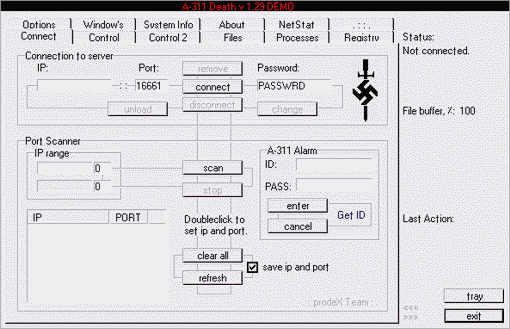 Remove A-311 Death - Remote Access Trojan (RAT)Remote Access Trojan or RAT for short is form of trojan horse that is often called backdoor because it provides the intruder, or remote user (hacker) special access (hole) to your PC from some control features to full control. A-311 Death is classified as RAT because of it affect to infected system. A-311 Death is considered to be very dangerous as it uses special technic to hide its activity from user and antivirus applications. Usually firewalls can detect its activity as A-311 Death regularly tries to access internet to grant an access to its owner. Description of A-311 Death and certain parameters of the threat. A-311 Death operates in background and screens from the buyer. However, they aren't virus, do not propagate by themselves and generally do not have adventitious devastating functions or other harmful payload content. There are two primary ways unsolicited A-311 Deaths can get into the computer. True RAT is ad creations targeted mostly to PC administrators. Parasitical A-311 Deaths can be finded and removed with the help of effectual anti-spyware products like Stronghold Antivirus and True Sword. If the hacker was unable to get any helpful and wholesome data from an dirty computer or have already pinched it, he eventually may eradicate the entire computer with the purpose to annihilate his traces.