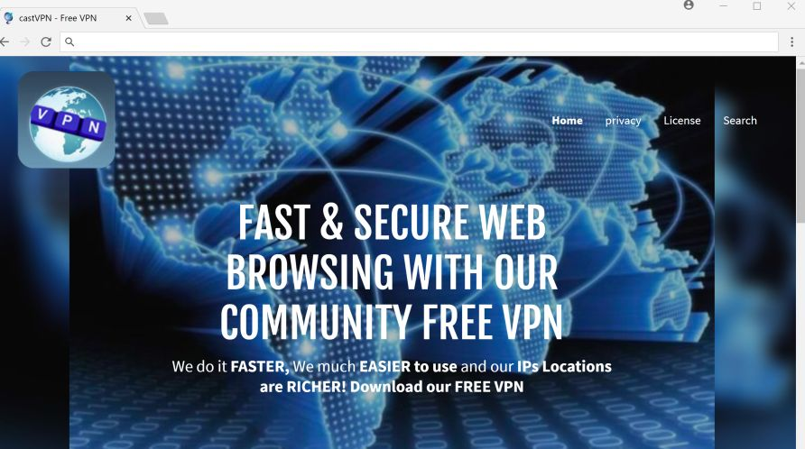 CastVPN installs on your PC along with free software. This method is called "bundled installation". Freeware offers you to install additional module (CastVPN). Then if you fail to decline the offer it starts hidden installation. CastVPN copies its file(s) to your hard disk. Its typical file name is (random file).exe. Then it creates new startup key with name CastVPN and value (random file).exe. You can also find it in your processes list with name (random file).exe or CastVPN. Also, it can create folder with name CastVPN under C:\Program Files\ or C:\ProgramData. If you have further questions about CastVPN, please ask below. You can use programs to remove CastVPN from your browsers below.