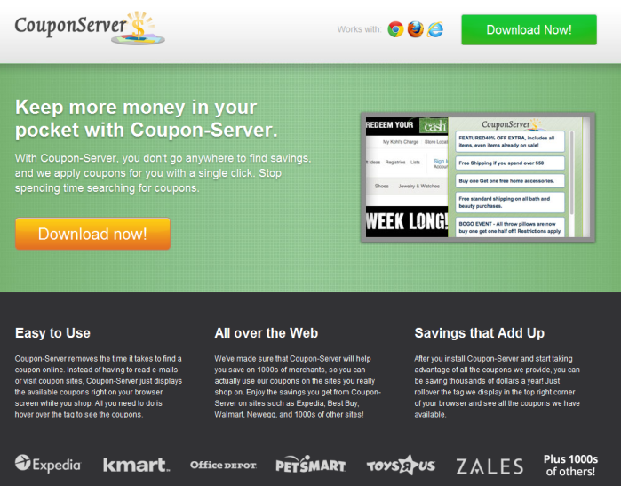 Coupon Server installs on your PC along with free software. This method is called "bundled installation". Freeware offers you to install additional module (Coupon Server). Then if you fail to decline the offer it starts hidden installation. Coupon Server copies its file(s) to your hard disk. Its typical file name is Coupon Server.dll. Then it creates new startup key with name Coupon Server and value Coupon Server.dll. You can also find it in your processes list with name Coupon Server.dll or Coupon Server. Also, it can create folder with name Coupon Server under C:\Program Files\ or C:\ProgramData. If you have further questions about Coupon Server, please ask below. You can use programs to remove Coupon Server from your browsers below.