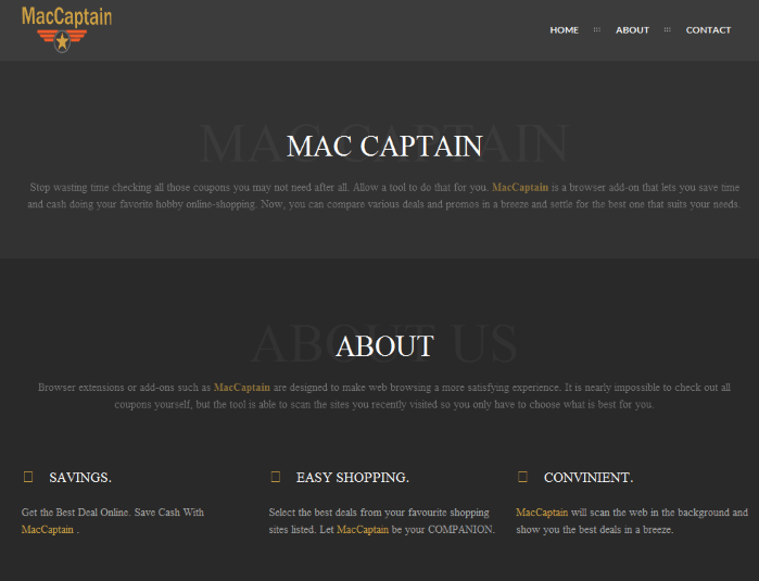 MacCaptain installs on your PC along with free software. This method is called "bundled installation". Freeware offers you to install additional module (MacCaptain). Then if you fail to decline the offer it starts hidden installation. MacCaptain copies its file(s) to your hard disk. Its typical file name is MacCaptain.dll. Then it creates new startup key with name MacCaptain and value MacCaptain.dll. You can also find it in your processes list with name MacCaptain.dll or MacCaptain. Also, it can create folder with name MacCaptain under C:\Program Files\ or C:\ProgramData. If you have further questions about MacCaptain, please ask below. You can use programs to remove MacCaptain from your browsers below.