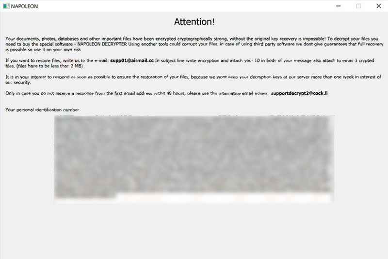 Threat's profileName of the threat: Command or file name: Threat type: Affected OS: Napoleon Ransomware (randomname).exe Ransomware Win32/Win64 (Windows XP, Vista/7, 8/8.1, Windows 10) Napoleon Ransomware is new ransomware similar to Blind ransomware, that appends .supp01@airmail.cc].napoleon extension to encrypted files.