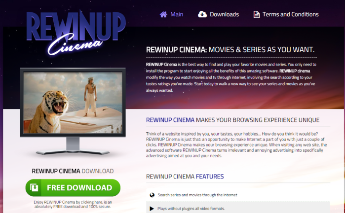 Rewinup Cinema - is rogue web-browser application, which is developed by cyber crooks. It can be installed on different browsers, such as Google Chrome, Internet Explorer, Mozilla Firefox. Rewinup Cinema is described as browser media player with good quality, but it is considered as potentially unwanted program. Why? Because it displays various banners, videos and pop-ups on the screen. It annoys user a lot, so we recommend to remove Rewinup Cinema from PC.