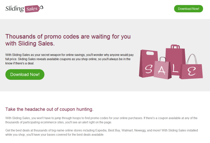 Sliding Sales installs on your PC along with free software. This method is called "bundled installation". Freeware offers you to install additional module (Sliding Sales). Then if you fail to decline the offer it starts hidden installation. Sliding Sales copies its file(s) to your hard disk. Its typical file name is sliding-sales.dll. Then it creates new startup key with name Sliding Sales and value sliding-sales.dll. You can also find it in your processes list with name sliding-sales.dll or Sliding Sales. Also, it can create folder with name Sliding Sales under C:\Program Files\ or C:\ProgramData. If you have further questions about Sliding Sales, please ask below. You can use programs to remove Sliding Sales from your browsers below.