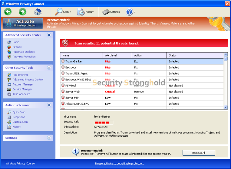 Threat's profileName of the threat: Command or file name: Threat type: Affected OS: Windows Privacy Counsel Protector-(random 4 letters).exe Rogue Win32/Win64 (Windows XP, Vista, Windows 7, Windows 8/8.1, Windows 10) Windows Privacy Counsel is one of the rogue programs of FakeVimes family. This program can be installed on your computer by a Trojan that you can catch, reading your e-mail from unknown user or visiting some suspicious sites. The user even will not notice the moment when the program will be installed, but after the next reboot, Windows Privacy Counsel will show itself. The user will see numerous security alerts and scan results, reporting that the computer is infected with different kinds of infections. The user should not believe to fake antivirus program, because it will try to get his money and will not help to get rid of the viruses that are really exist in the system.