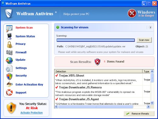 Threat's profileName of the threat: Command or file name: Threat type: Affected OS: Wolfram Antivirus Wolfram Antivirus.exe Rogue Win32/Win64 (Windows XP, Vista, Windows 7, Windows 8/8.1, Windows 10) Wolfram Antivirus is from the family as OpenCloud Security and OpenCloud Antivirus rogues with the same infecting routine and malicious behavior.
